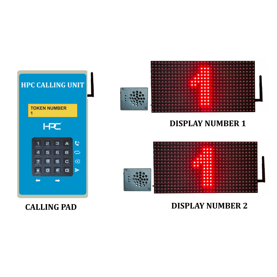 Introducing HPC Wireless Token Calling System or Queue Management Display System for hospital, banks, hotels, service centers, colleges etc. for smart queue management. This system operates on wireless Operation. The Calling Pad unit operated on 9v DC adapter & Display unit operates on 5v DC Adapter. System consist 32 x 16 P10 LED display unit which Clearly visible from 10 meter distance. Calling Pad unit comes with numeric keypad for smooth token number entry. It has around 30 to 50 meter connectivity range for operation. Audience display unit has inbuilt Hindi & English voice system with loud speaker. Unique & user-friendly design. Package contain- 1 Calling Pad Unit, 1 P10 LED Display, 1 Speaker, 2 Adapter, User Manual.